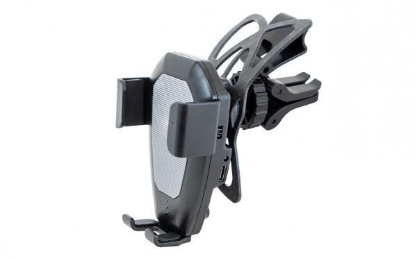 Charge your phone on the go with this wireless charging universal phone cradle. Included is a vent clip that attaches easily to car air vents for secure mounting in any vehicle. This wireless charging universal cradle uses Qi wireless charging technology to quickly recharge compatible smartphones without plugging power cords into the device.